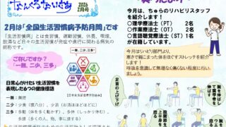 全国生活習慣病予防月間2月は「全国生活習慣病予防月間」です。「生活習慣病」とは食習慣、運動習慣、休養、喫煙、飲酒などの日々の生活習慣が発症や進行に関わる病気の総称です。『一無、二少、三多』をご存じですか?日常心がけたい生活習慣を表現した6つ...